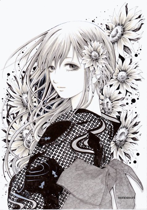 #イラスト アナログ 庭の紫陽花が咲いた時期に描いたイラスト。元はカラーだけどモノクロにした方が個人的に好きだった。