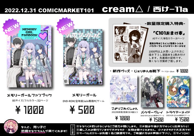 ✶C101のお品書きです!✶ ▼event コミックマーケット101 12月31日(土) 西2け-11a サークル:cream△ ▼BOOTH通販あります nohana-cream.booth.pm ※12/30までにご注文下さった方に「C101おまけ本」を必ずお付けします! ▼売り子 恋摘もなかちゃん(@mona_ka_san ) やった~~! #C101お品書き