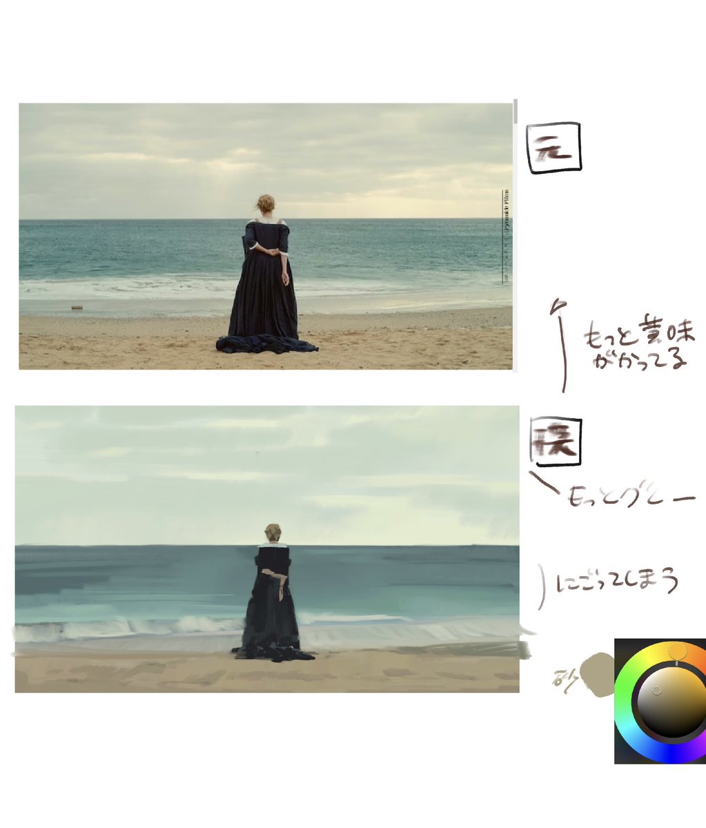 34 232 #色と光のマジック・カラーでストーリテリング・第一弾 第3週の課題です なんとなく..じゃなくて、感情やライティングを狙って描くのが難しく、新鮮でした。次はもっと強調したものを描いてみたい 23/04/10 15:20