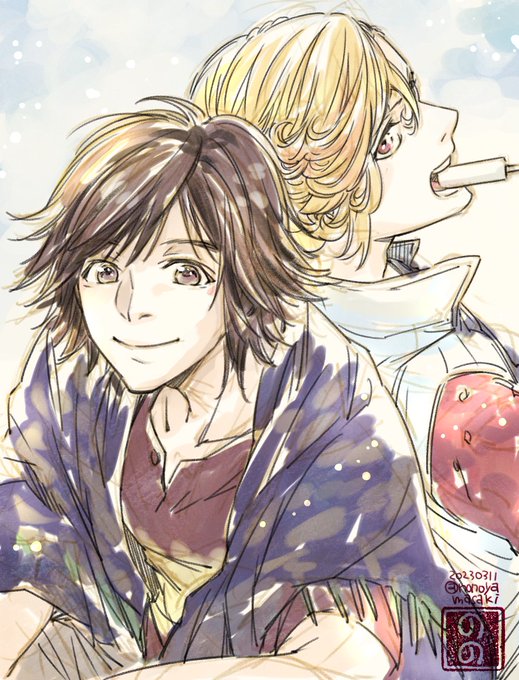本日は『断罪六区』コミックス2巻告知イラスト更新です!2巻発売に喜んでる(?)ふたりで😙✌️ 全体図はリンク先のコミックデイズでどうぞ〜! comic-days.com/episode/485600…