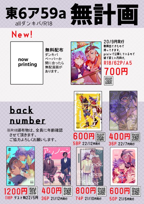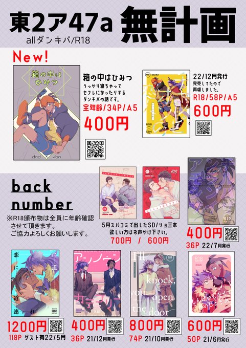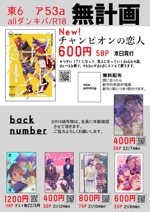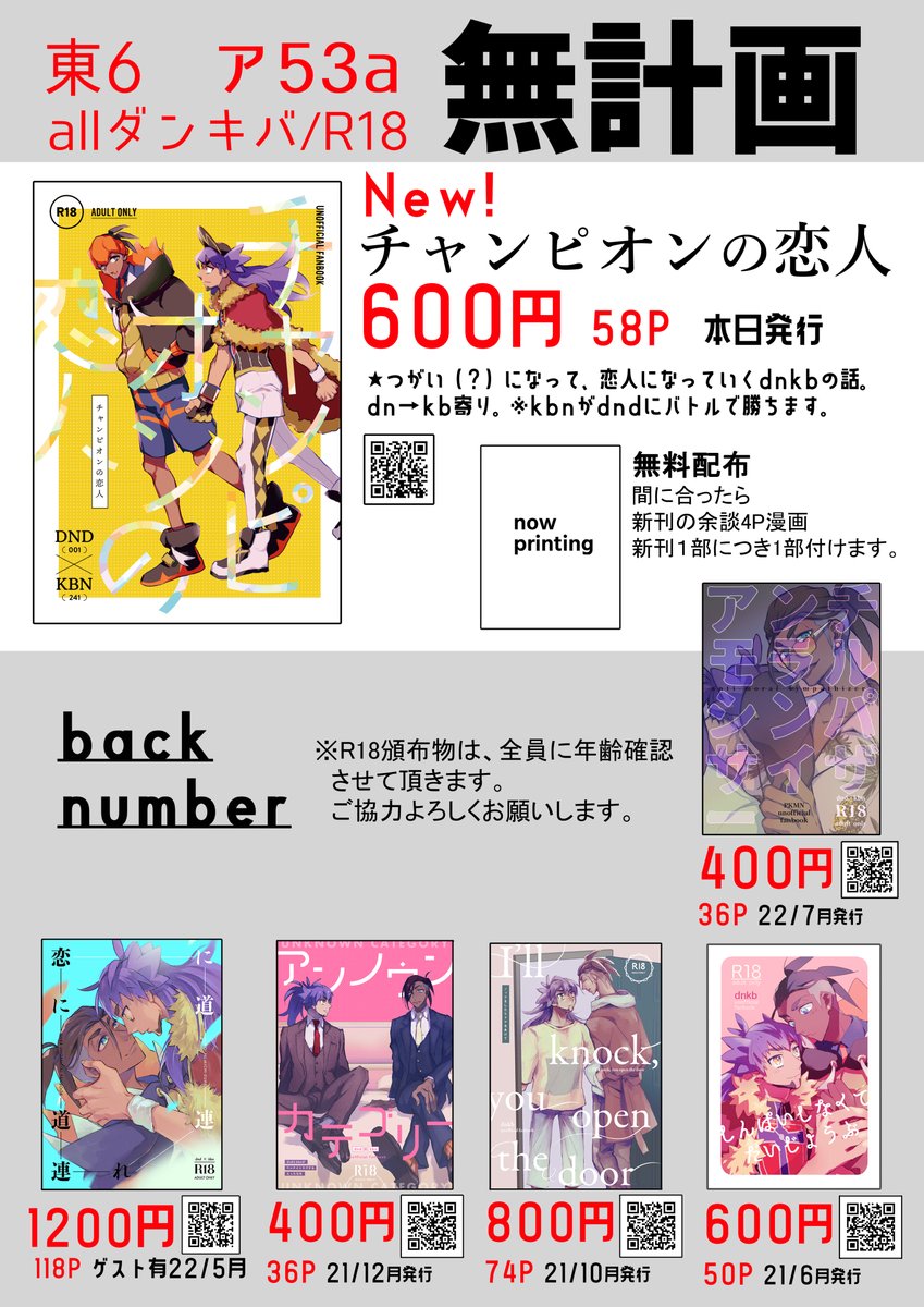 【2/12頂上熱戦】おしながき【dnkb】 #pixiv pixiv.net/artworks/10527… 遅くなりましたが明日! 東6ア59a 無計画 今回新刊ないので、お買い物終わった後にでもペーパーもらいに来てくれるとうれしいです~✨ そして引っ越しでdnkb一冊目の本出てきたので持っていきます~!よろしくお願いします!💜🧡