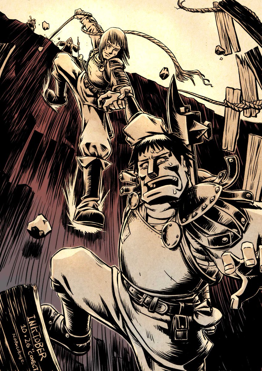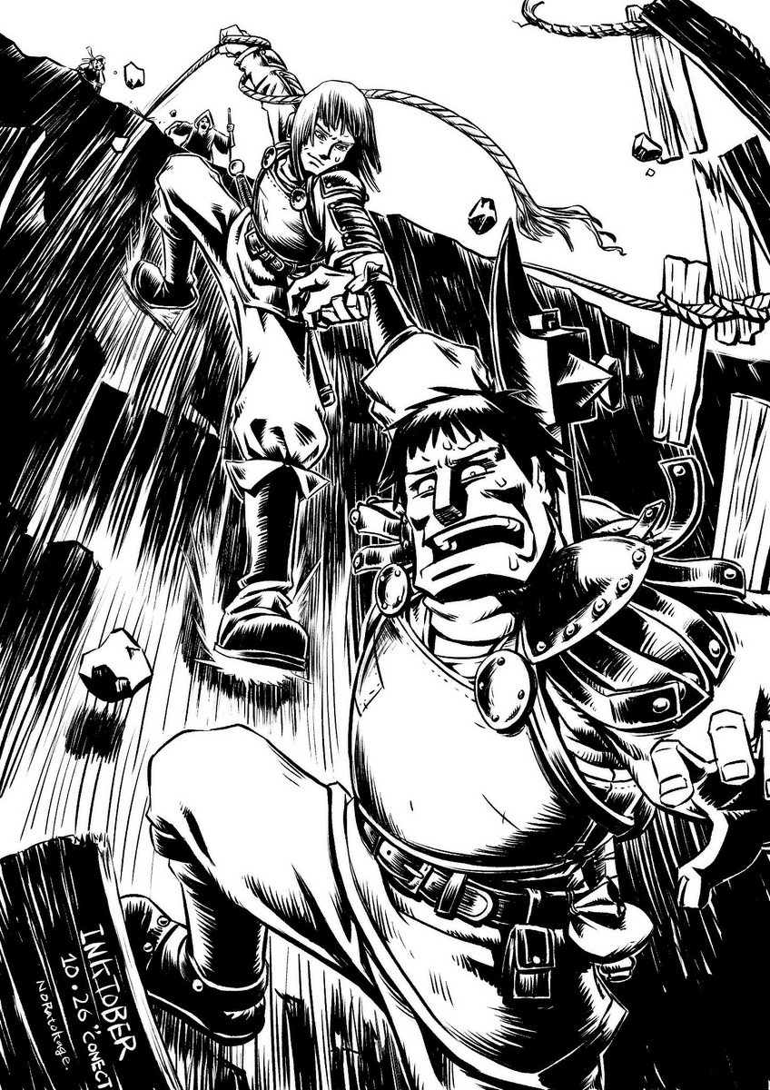 #inktober #inktober2021 #絵 #イラスト #illustration #2D #digitalpainting #CLIPSTUDIOPAINT #絵描き人 公式お題「CONECT(繋ぐ)」 吊橋が落ちて、剣士がファインプレイ...いやこれ、手首脱臼するんじゃ・・・