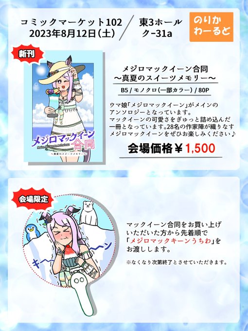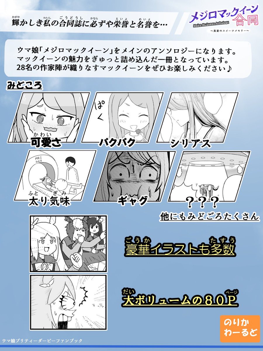 新刊「メジロマックイーン合同 〜真夏のスイーツメモリー〜」のご紹介です!マックイーンの魅力を詰め込んだ合同誌です!28名の作家陣が描くマックちゃんを是非お楽しみください!こちら夏コミ一日目に頒布いたします #マックイーン合同 ↓メロンブックス様でも予約開始です melonbooks.co.jp/detail/detail.…