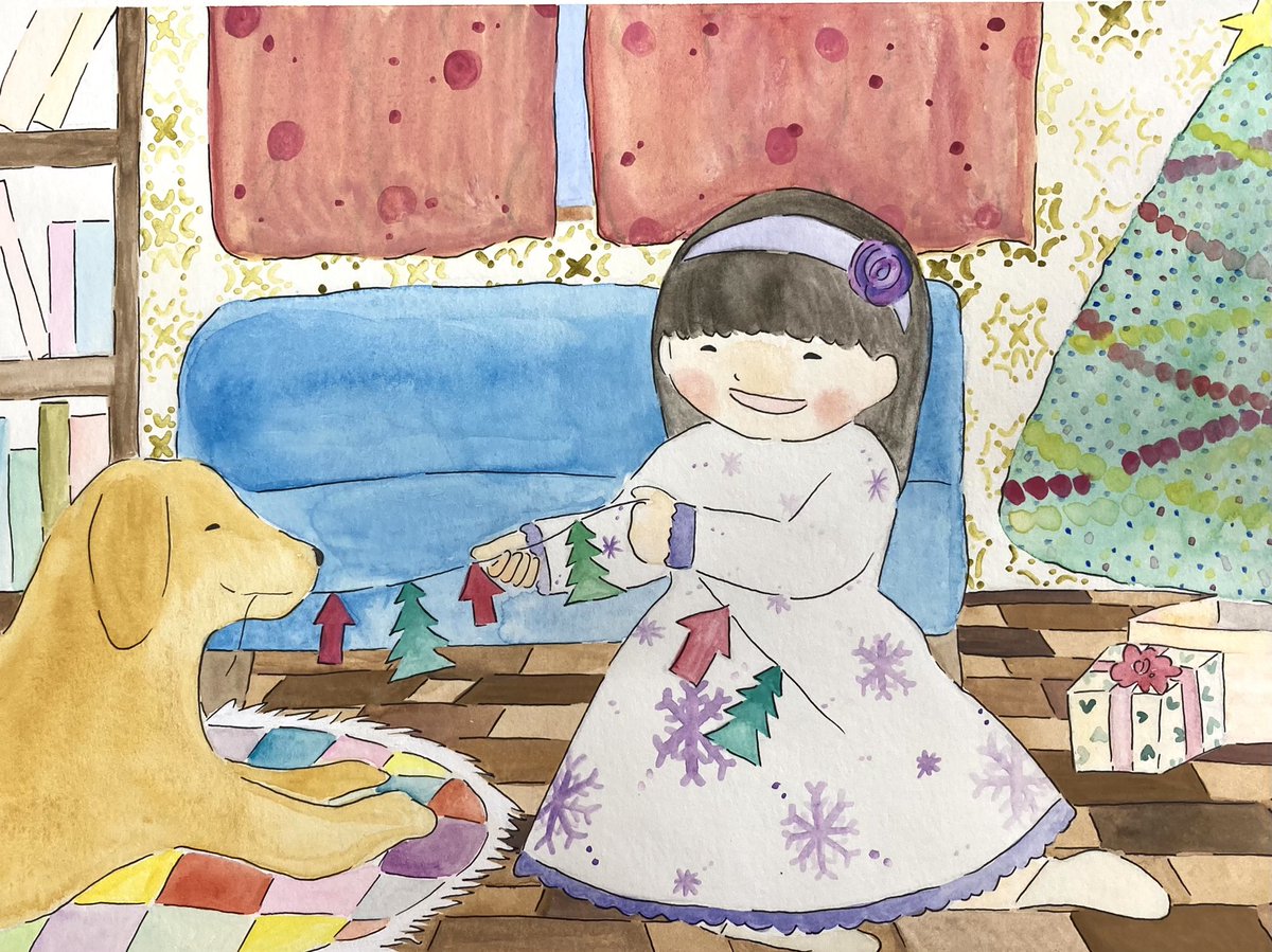 もうすぐクリスマス🎄✨ 女の子とわんちゃん #お絵描き #イラスト #水彩