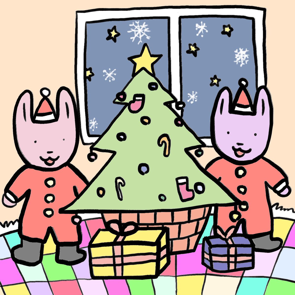 Merry Christmas✨ ツインうさぎの ルーとズー🐇🐇 クリスマスツリーの横で サンタさんになっちゃった🧡 楽しいパーティーのはじまり🎄✨ 素敵なクリスマスを🌟 #お絵描き #イラスト