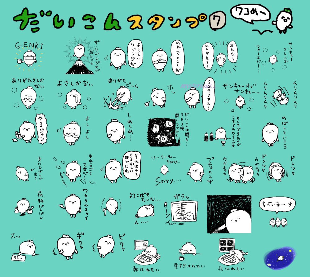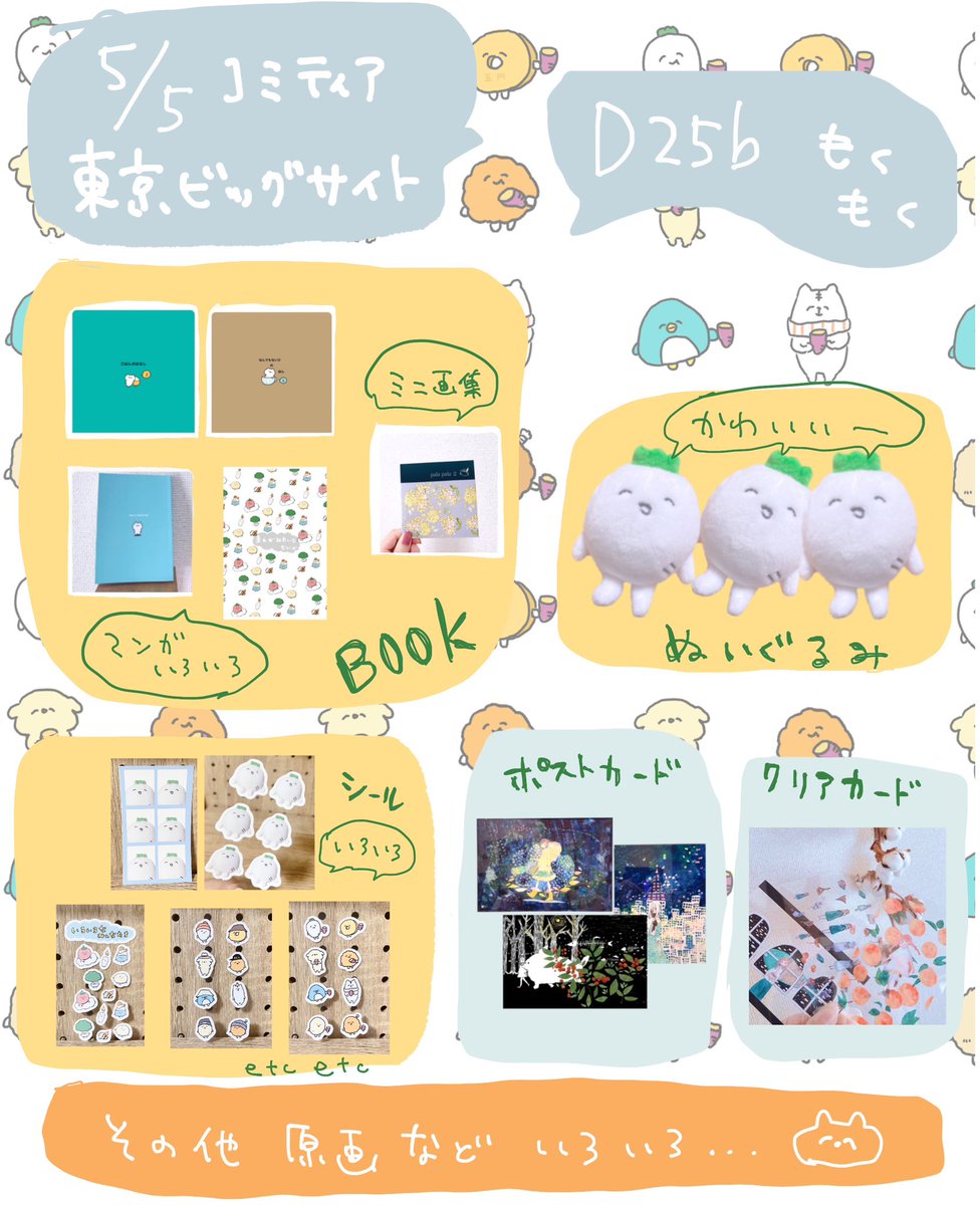 エアで参加させて頂きます🤲 絵や日常漫画を描いたり何かを作ったりしています。 だいこんのぬいぐるみや日常漫画などの通販は、5/6の夜からオープンする予定です🥕 (LINEスタンプ store.line.me/stickershop/au…) #エアコミティア #エアコミティア140