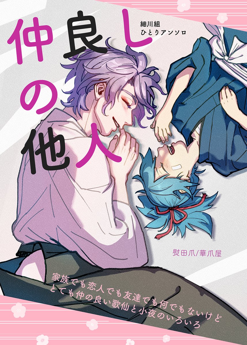 5/4 超閃華の刻2022 のお品書き・新刊サンプルです。(1/3) 新刊 『細川組(歌仙・小夜)ひとりアンソロ〜仲良しの他人』 B5/本文84p/1000円 あと既刊2冊を持っていきます。