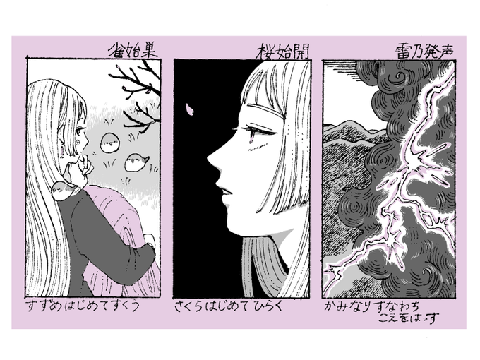 「春分」イラストまとめ 初候・「雀始巣(すずめはじめてすくう)」 次候・「桜始開(さくらはじめてひらく)」 末候・「雷乃発声(かみなりすなわちこえをはっす)」 #二十四節季七十二候 #イラスト #illustration