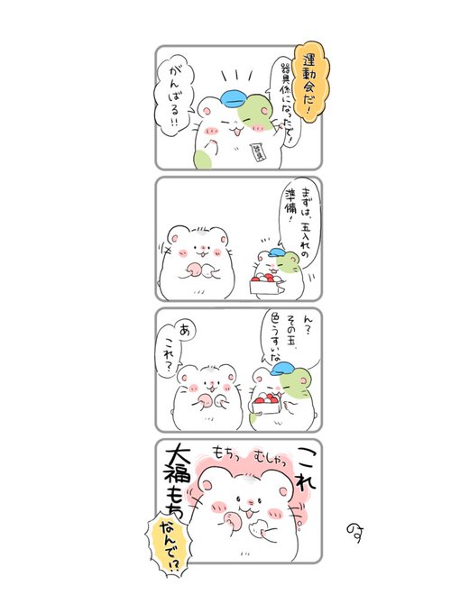玉じゃありません、大福です。 #イラスト #ゆるいイラスト #まんが #4コマ #ハムスター #運動会 #イラストレーション