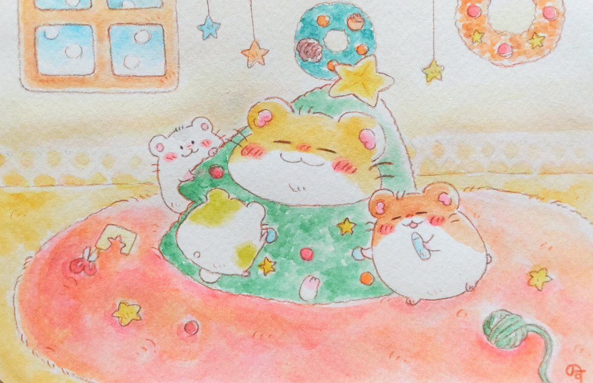 1 13 おっきなクリスマスツリー🎄 #ゆるいイラスト #イラスト #水彩色鉛筆 #アナログイラスト #ハムスター #イラストレーション 22/12/12 22:27