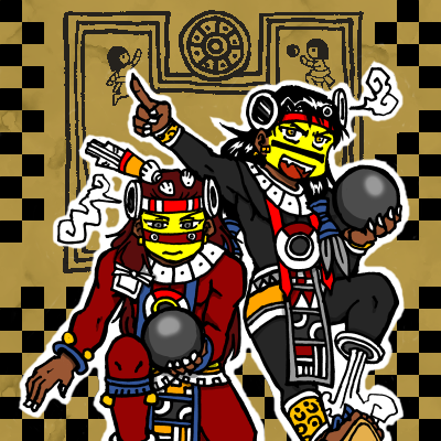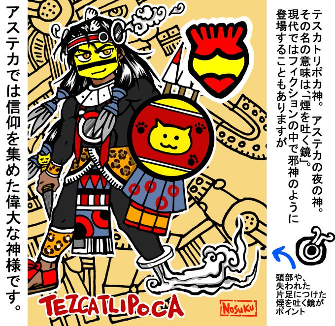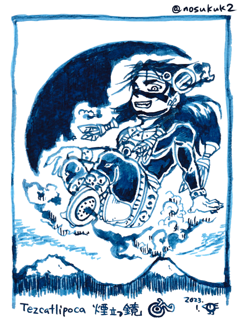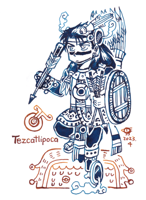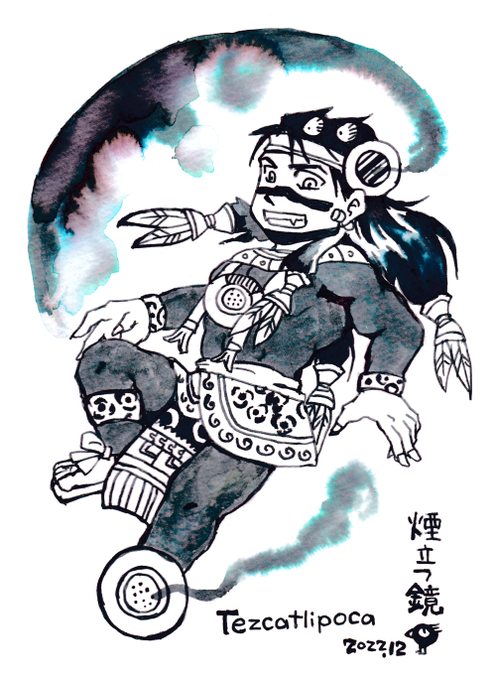 お題:神話伝承の【煙にまつわる者】 🪞🌋 アステカの夜の神テスカトリポカ様です。 お名前の意味は「煙立つ鏡」。 煙を立てる黒曜石の鏡を、失われた足のかわりにつけておられます。 一年中テスカ様を描いているのですが、久々にワンドロ参加しました。 #神話版深夜の真剣お絵かき60分勝負 @sinwa1d