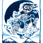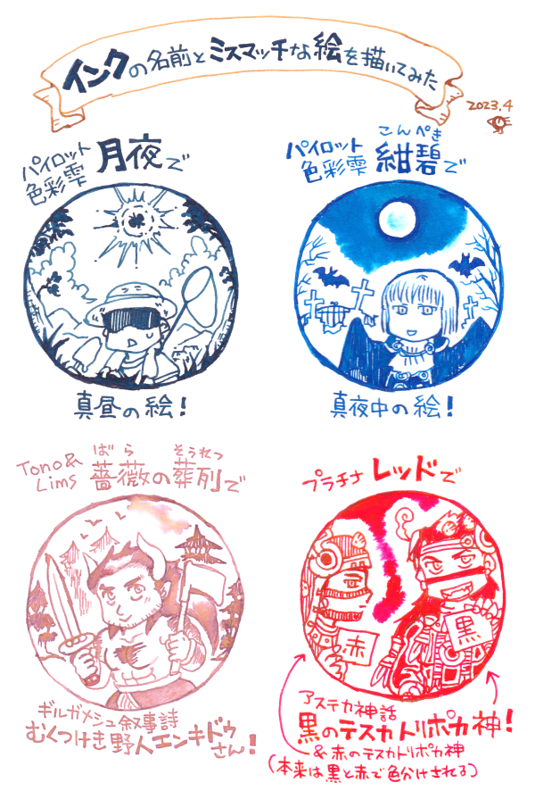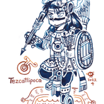 アステカ絵。 夜の神、煙立つ鏡、テスカトリポカ神です。 鏡の模様については、約翰さまのツイートを参考に描きました(こめかみの鏡が水の模様、足の鏡が土の模様)。 🚬🪞 インク:カラーバーインク ~ブル・ショット(ペンの線は黒いけど、水でぼかすとピンクや緑が出る) twitter.com/JohannesC7/sta…