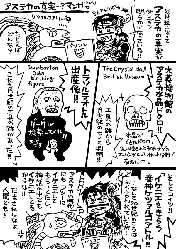 アステカの真実…?漫画。 大英博物館の水晶髑髏と、トラソルテオトル出産像は、19世紀の工具のあとがあったらしい(出産像の全体は "Dumbarton Oaks birthing figure" でグーグル検索してみてね)。 水晶髑髏ja.wikipedia.org/wiki/%E6%B0%B4… Mexicolore: Aztec ‘Birthing Figure’ mexicolore.co.uk/aztecs/artefac…