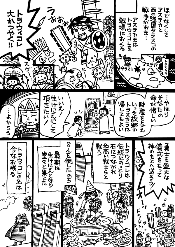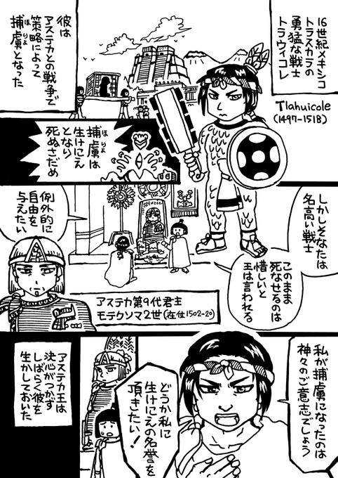 アステカ漫画。戦争捕虜が生贄になる定めの社会で、アステカ王の情けを突っぱねて、潔く宿命に従った勇士トラウィコレの伝説。当時の戦士の誇りや価値観が見えるお話です。 🇲🇽 Tlahuicole en.wikipedia.org/wiki/Tlahuicole