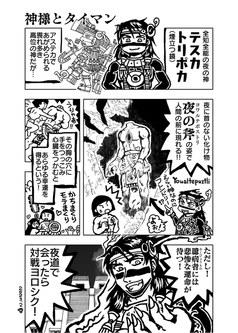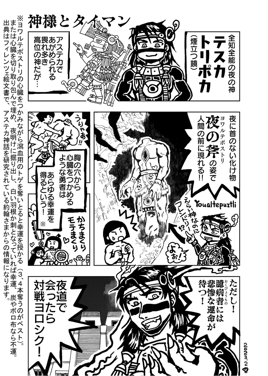 なお、「恋に悩む若者が、夜道でテスカトリポカ神にタイマンを挑んで勝ち、恋の願いを叶えてもらった」話は、約翰さまの研究によると、夜の斧の逸話を元にした、日本人の創作らしい。昭和3年初版『神話伝説体系メキシコ・ペルー神話伝説集』の「決死の組打」が初出。 dl.ndl.go.jp/pid/1717930/1/1