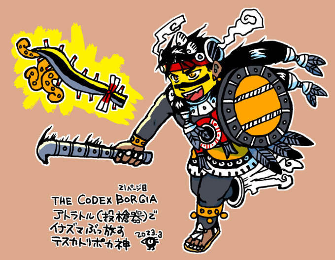 アステカ絵。ボルジア絵文書より、アトラトル(投槍器)でイナズマをぶっ放す、夜の神テスカトリポカ様。なんだか楽しそうです。 🪞🚬⚡️ アステカ神話を研究されている約翰さまのツイートを参考にしました。 twitter.com/JohannesC7/sta…