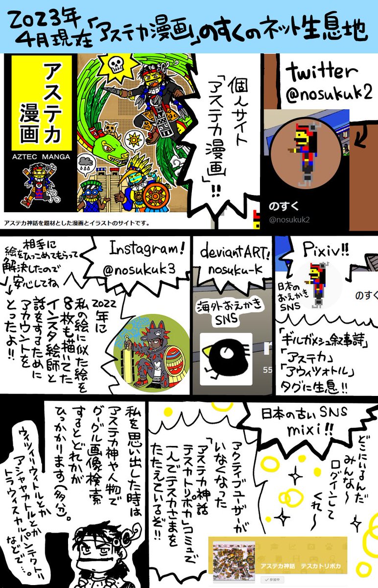 2023年4月現在の「のすく」のインターネット生息地です。サイト「アステカ漫画」のトップページにリンクを貼っています。その他のSNSは、知り合いが多くいるところがあったら追加で始めるかもしれませんが、どういうSNSがあるのかを把握してないです。 🌵 アステカ漫画 nosukuk.mangalog.com