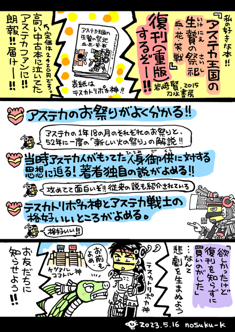 ㊗️『アステカ王国の生贄の祭祀』が復活!㊗️ 好きな本なので嬉しいです。復刊ドットコムで先行予約ののち、一般書店に並ぶもよう。人気ゲームFGOで歴史や神話が話題になり、関連する本が重版するのを今までにも聞きましたが、アステカでも起きるとは…!(ポカニキファンの皆様ありがとう…✨) twitter.com/tousuishobou/s…