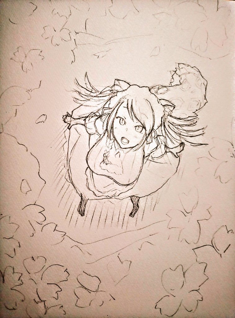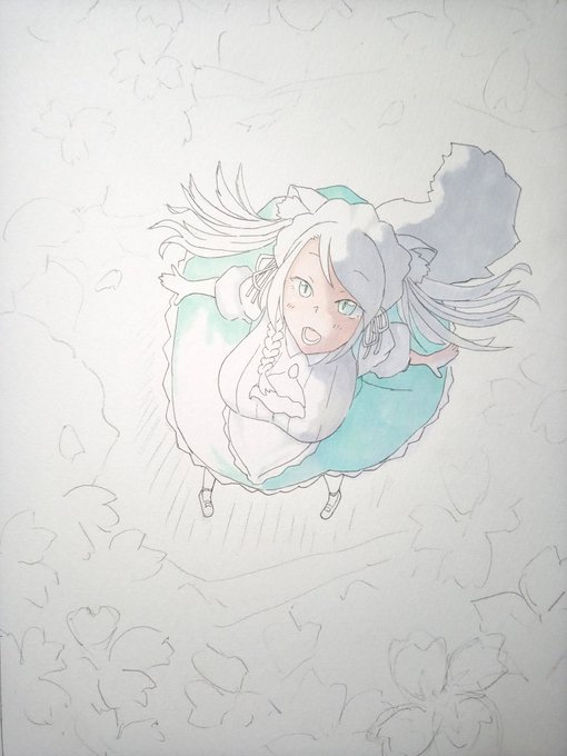 8 35 【下描き】満開の桜を見上げる雛森アンシアさんの図🐷ルシアンさん良いアイディアをありがとうございます🐷💚 頑張って完成させます🌸 #あんしあーと 22/04/13 09:47