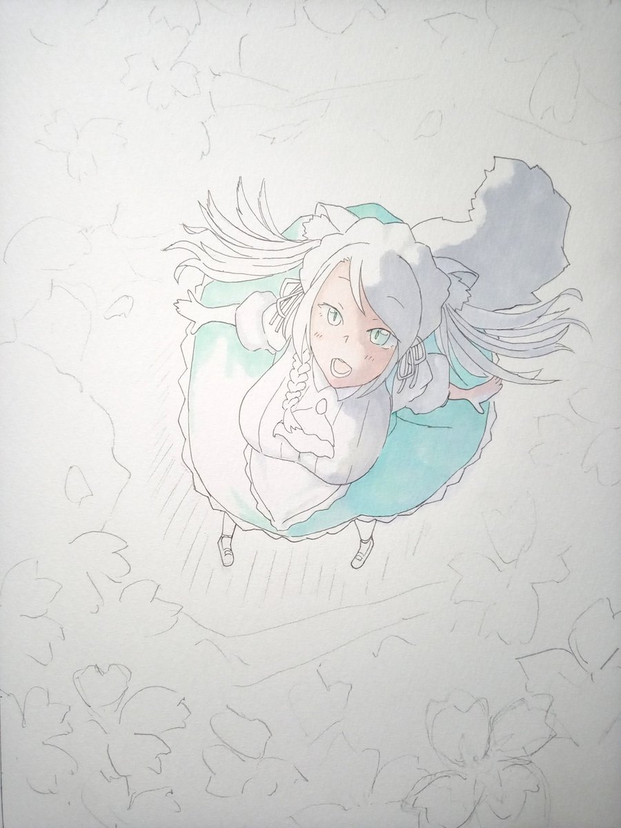 【下描き】満開の桜を見上げる雛森アンシアさんの図🐷ルシアンさん良いアイディアをありがとうございます🐷💚 頑張って完成させます🌸 #あんしあーと
