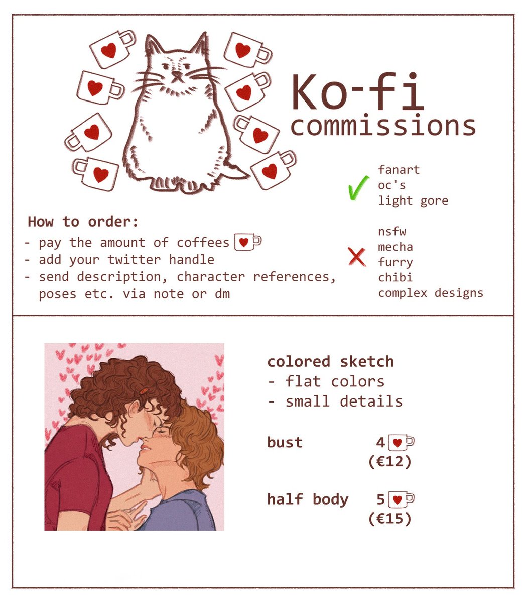 hey lovelies! i'm opening up ko-fi commissions ˖♡ - 4-5 slots for now - one cup = €3 - if you have any questions, feel free to dm me! [rts are appreciated ♡] ☕️ ko-fi.com/notholaenas ☕️