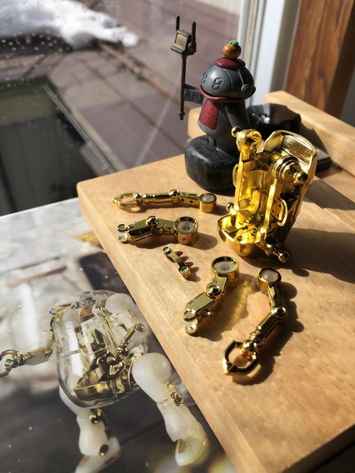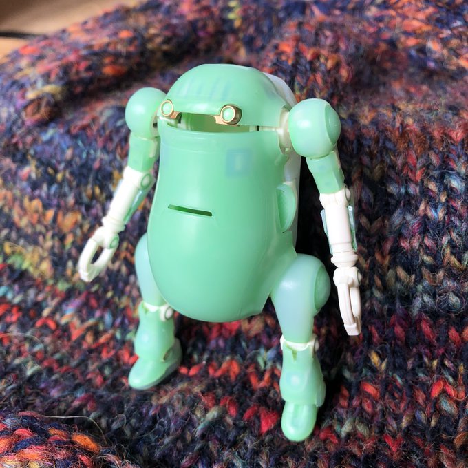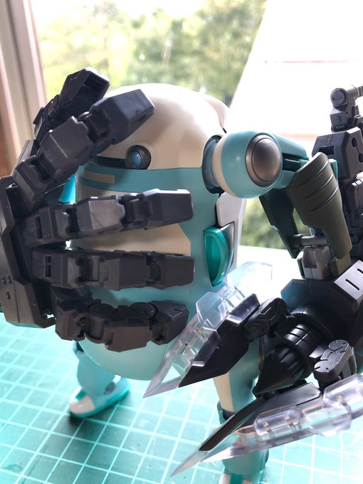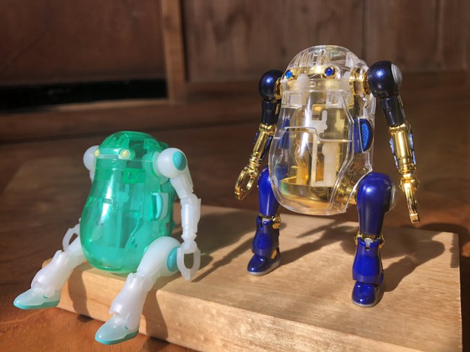 糸魚川のヒスイ君できたー! しーするーなパーツの裏面にポスカのきみどりを塗ったくりました! トップコートを裏面にだけ吹くのは初めての経験😆 #メカトロウィーゴ