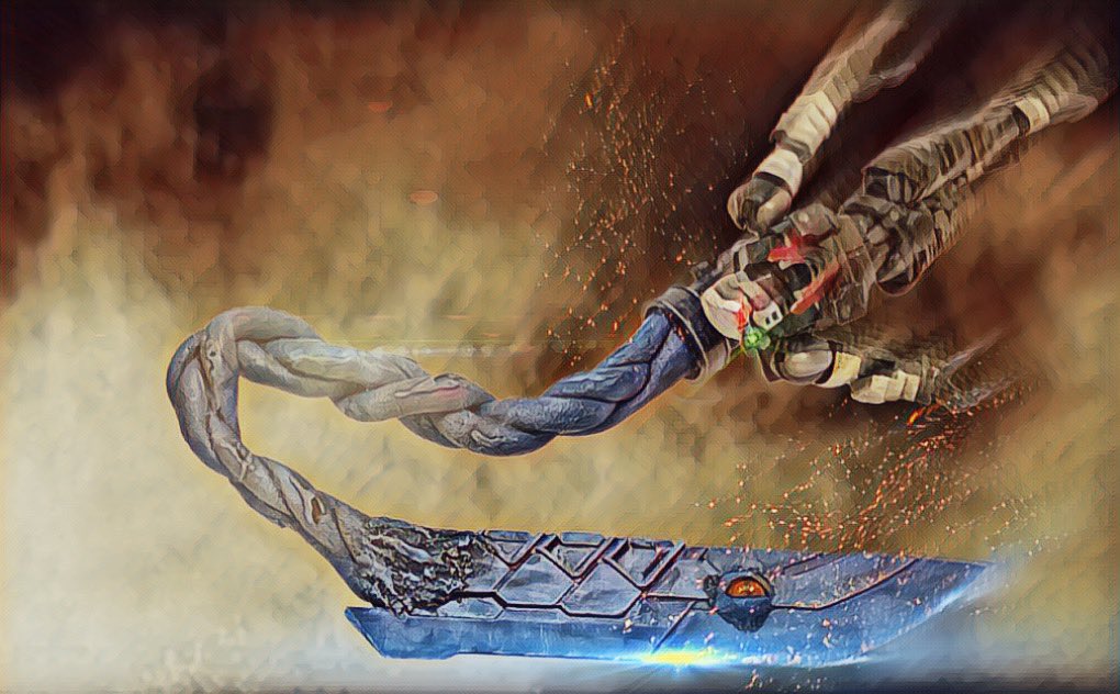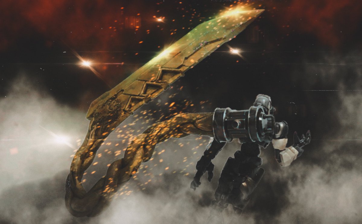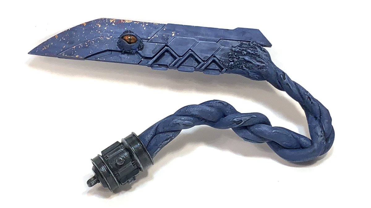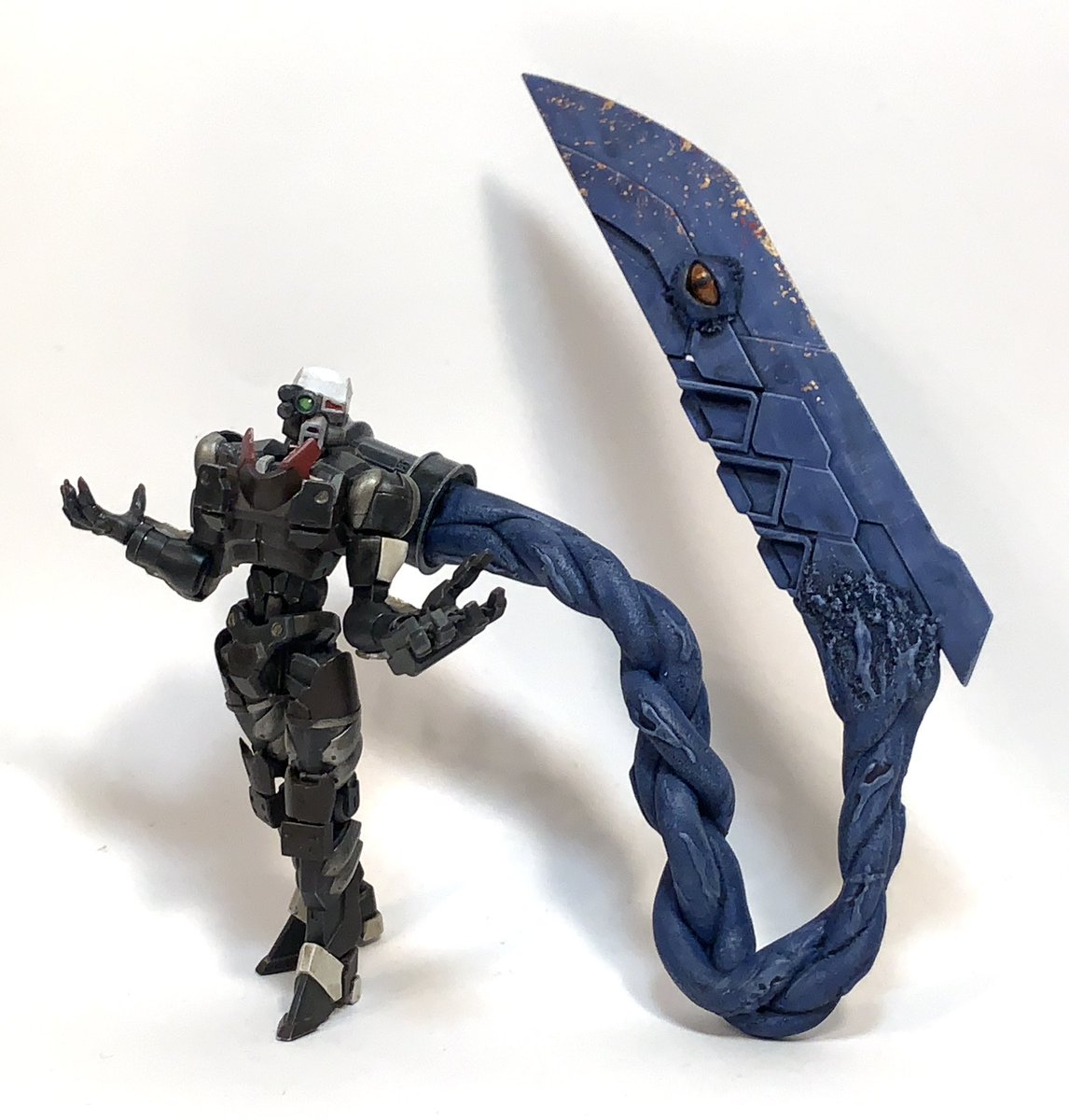 #今年作ったプラモ晒そうぜ ●ヴォイドウェポン【ダインスレイフ】 ディメ登呂丼さん@DimetroDOOONの催しにあわせて作成 つぶらな瞳がカワイイ子 巨大な武器&生物的な存在としてディテールを投入 Dr.ケイオスさんを電池にしている。部分的に金色に光っており、本気だすとスーパーサ○ヤ人になる