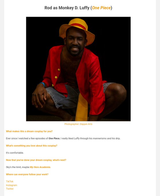Yo, I'm excited to announce that I'm on the Crunchyroll website for the #28DaysOfBlackCosplay . I cosplayed as Monkey D. Luffy from One Piece. Thank you @Crunchyroll