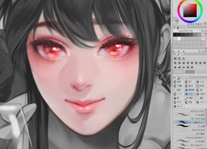 #SPY_FAMILY #ヨル・フォージャー #イラスト進捗 #イラスト #クリスタ #グリザイユ画法 #厚塗り 🌹ヨルさんのお顔をぬりぬり。 いつも控えめにしてしまう赤で攻められるの嬉しい。