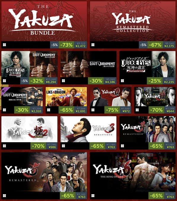 Steam版の龍が如くシリーズが春節セールで最大75%オフなどという狂った安さになってるので気になってる人は今がチャンスですよ!! ヤクザチャンス!! ▼SEGA LUNAR SALE 2023 store.steampowered.com/curator/363336…