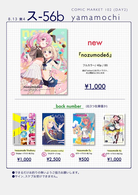 #C102 【 おしながき 】 日曜日、ス56bです。よろしくお願いします! 既刊のVの本以外は今回で最後かと、、! ポスター欲しい方いましたら売り子にお伝えいただくと抽選券お渡しします🙌(券10枚ほど)(14時半にお渡し可能な方) 🍈さま委託あります melonbooks.co.jp/detail/detail.…