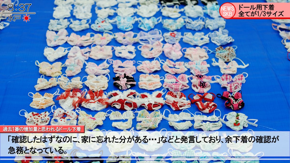 クリスマス未明、大量のドール下着が発見された。 専門家によると、開封・未開封合わせ前年比で26%(84着)増となっている。 確認されたのは405着だが、これはショーツ単品や、ガーターベルトなども1着とカウントしているのと、自宅に忘れた分がある事などから正確な数字ではない。