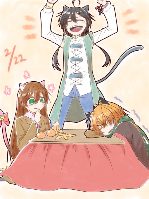 #猫の日 #絵描きさんと繋がりたい 猫の日、滑り込みぃ‼︎(*'▽'*) うちの子ルーレットでリエラ(左下の子)が当たったのでこのトリオで! 猫といえばコタツにみかん😊でもクラッドはぜんっぜん寒くないタイプだし、ルキヤは逆に死ぬほど寒さ苦手で動けないし、リエラはみかん食べ過ぎだし…(*・ω・)