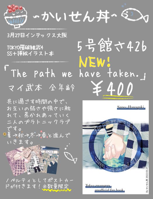 TOKYO罹破維武4 5号館 さ42b『かいせん丼』 インテックス大阪 マイ武本お品書きです! SS+挿絵イラストの合同本です。¥400 買った人にはランダムでポストカードが付きます👍 サークル初参加なんで緊張してます😂 新刊サンプルはpixivにあります〜! pixiv.net/artworks/96974…
