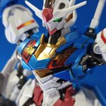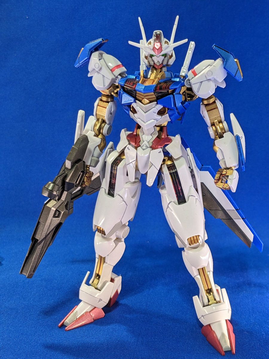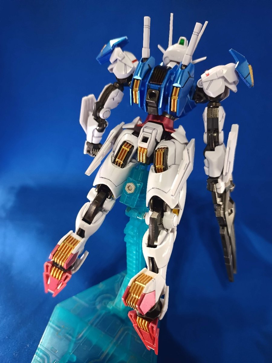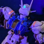 メタリック&ゴールドフレームVer.完成しました。白部分はRG風に3色塗り分け。シールはクリアパーツの裏しか使ってません。カメラと肩はブラックライトで光ります✨ #ガンダム #エアリアル #ガンプラの画像貼るとRTされると聞いて