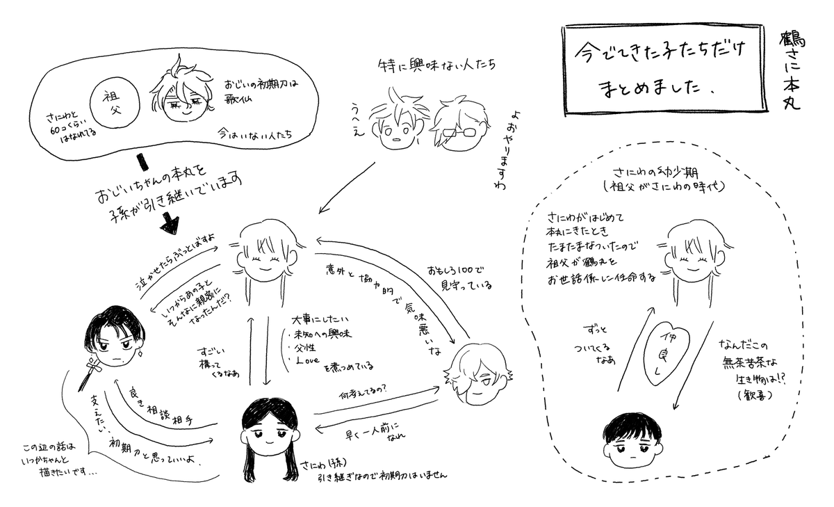 設定はその都度必要な部分だけ決めてくズボラスタイルゆえ暫定ではありますが、現時点でこんな感じです。漫画に反映しづらい小ネタをここぞとばかりに消化できたので大喜びしています☺️(鶴さに本丸の相関図は以前載せていたものと同じです)