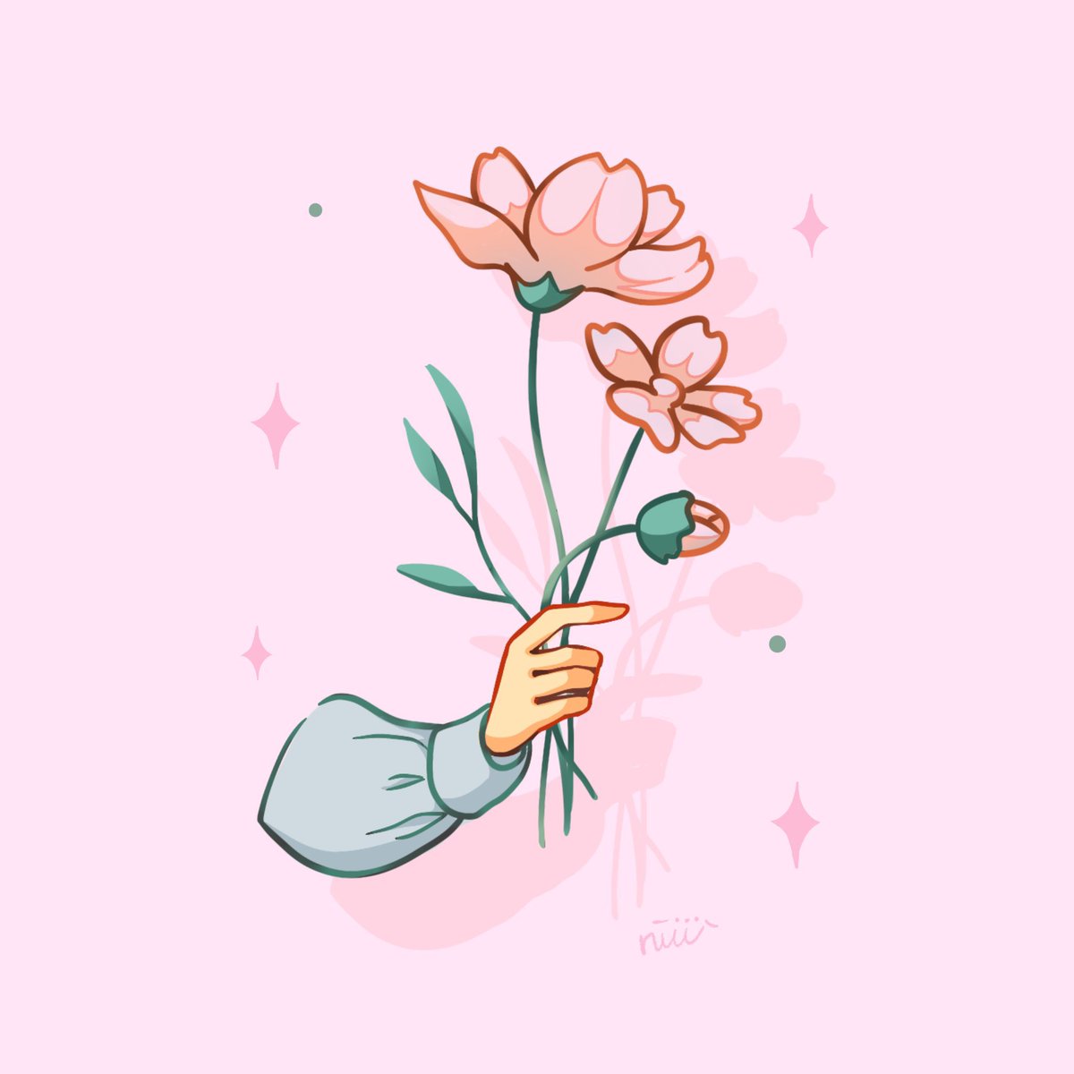 ずっと気になってたお花と手の練習🤙🥀 一日一個は、学びを見つけたい! •線画の重なる部分は色が濃い •花に水色を重ねるとちょっと透けて見える? #イラスト #イラスト好きさんと繋がりたい #コスモス