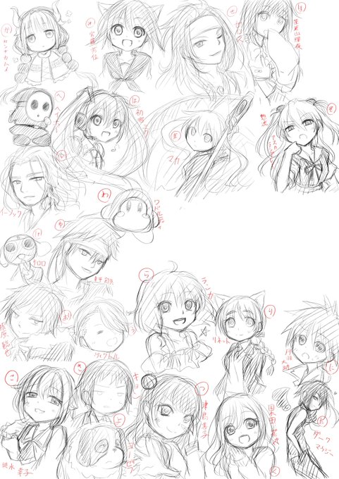 五十音順にキャラを描くやつ 面白そうだったから姉とやることに 初描きのキャラもちらほらいるけど 楽しいいいいい