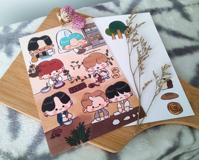 "Your Bakery" artprint 🥖🍞 - an imagination of a bakery run by 7 talented young men, working happily together to produce freshly-baked bread and pastries for forest dwellers 🌳 - because "Teamwork makes the Dreamwork" 🥺💜 #yourforest #btsfanart #doodles #armyshopsmall #bakery