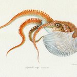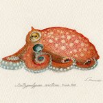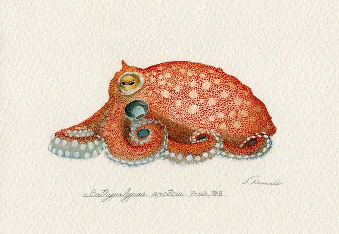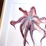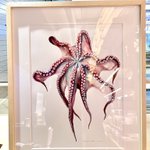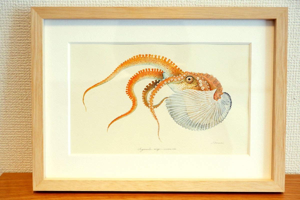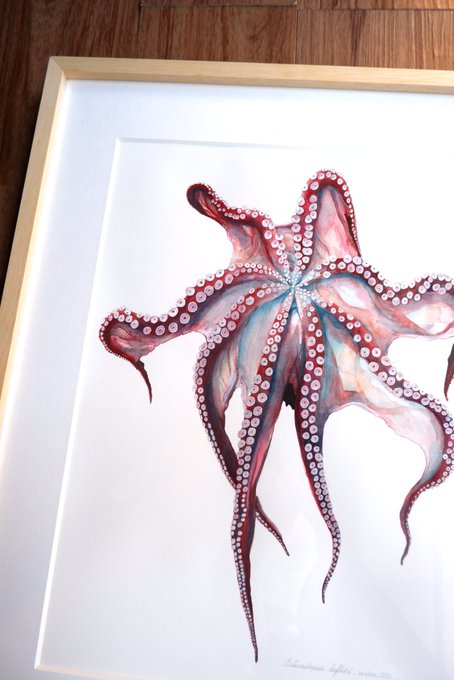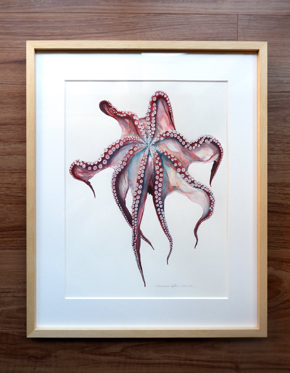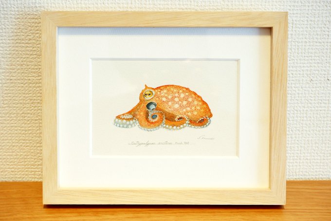 『ミズダコの吸盤展足画」 世界最大のタコ。死ねば色褪せてしまう生き物ですが、生きた色そのままに吸盤を見えるように展足した標本のイメージで描きました。 価格:140,000円 onl.sc/ywrBkNt