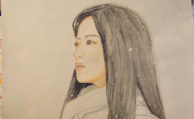 描いてる人が多いけど。美人は難しい。でも描きたい。 わずかなラインの違いで全然変わる。 どうやってもちょっと大人びた顔になった。 #水彩画 #橋本環奈 #美人画