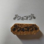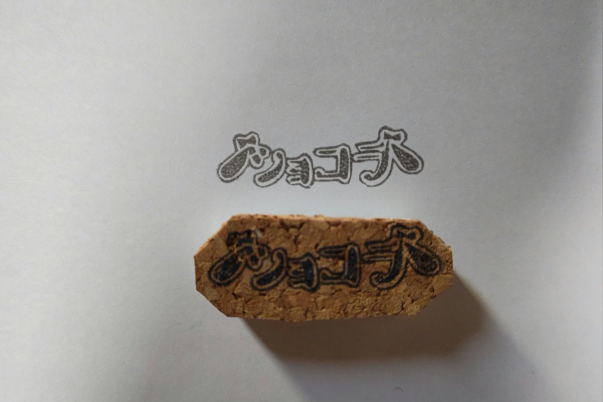 今日の消しはんはショコラちゃんのロゴを彫ってみました! 気持ちオシャレにコルクシートで持ち手も付けてみた(*´ω`*) #ショコラのお絵かき教室