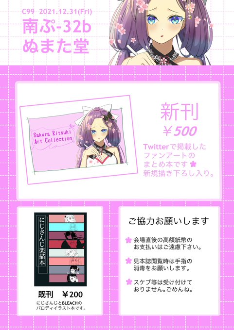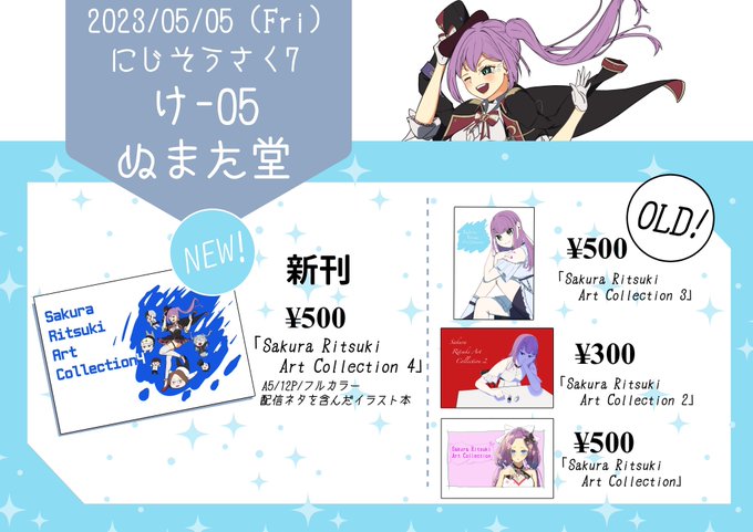 7 10 お品書きです 明日のにじそ7、け-05にて桜凛月中心のフルカラーイラスト本出ます🌸 今回はジョルジュ上条(@extheworld )さんにゲスト原稿と売り子を手伝って頂きます。 明日はよろしくお願いします🙇 #にじそうさく07 23/05/04 14:35