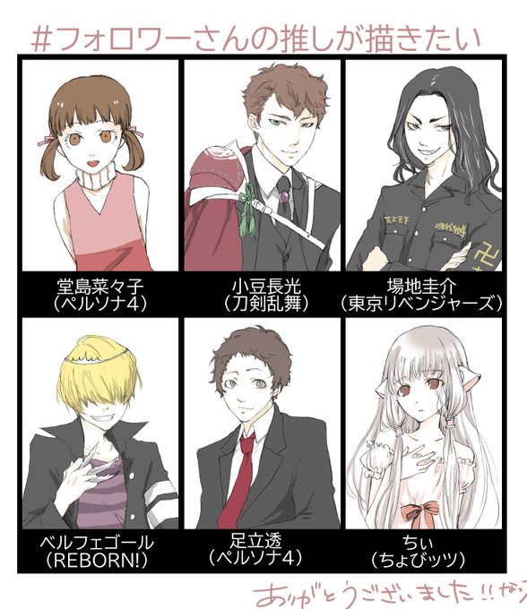 #フォロワーさんの推しが描きたい 6名様くらいまで。こなけし 未履修ジャンルも描きます~本人は最近リボーンとrkrnが熱い 匿名は↓からどうぞ odaibako.net/u/nuttyspoon