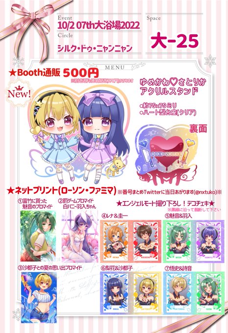 #07th大浴場2022 10/2のお品書きです! 💛配置【大-25】 内容➡︎グッズ販売、ネットプリント BOOTHのURL、ネップリ番号(ローソンが肌色が綺麗でオススメ)は当日イベントページが公開されたらツイッターでもお知らせします! よろしくお願いします🙇♀️