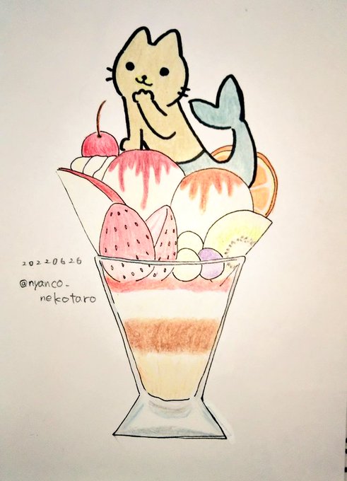 8 233 パフェの上のぱふぇちゃん #ねこようかい #ぱふぇちゃん #お絵かき 22/06/26 08:05