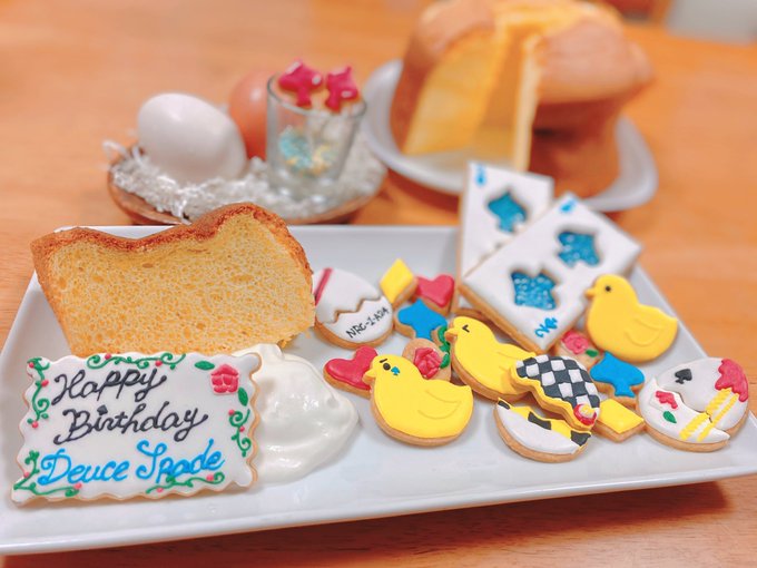 もう追っかけて10年になるらしいですよ!! アクキーフラミンゴ伊月のアイシングクッキーと完全再現コーヒーゼリーとアリスリスペクトクッキーとギミックの中身とか沢山モチーフ盛り込んだので見てください!!!🙌 伊月くんおめでとう!!!! 愛は無限大に込めたよ!!!!!! #伊月俊生誕祭2021