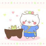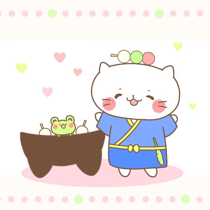 🐱「じゃーん!実は僕の帽子の中には、お団子が🍡はいってるんだよー!」 🐸「すごーい!みんなで食べよ~✨💛」 #ネコ #団子 #ゆるいイラスト