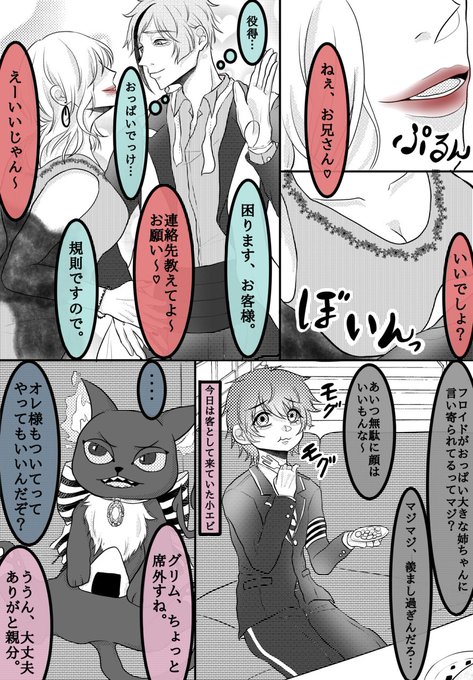 フロ監前提のフロ+グリ。🐬と🦐は会話だけ。🦈先輩と🐱が仲良くしてるだけの姿を100年みたい。(内容はファンアートかと思ったけど一応フロ監なので…) #twstプラス
