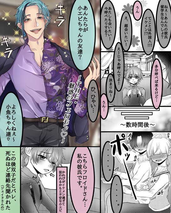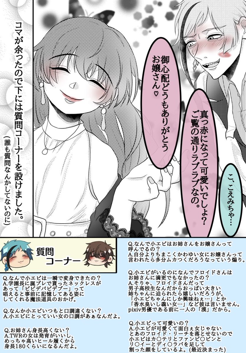 173 2552 フロ監♀(普段は男装)(顔あり)🦈🦐 🦈さんがおっπが大きいお姉さんに迫られ🦐がプチ嫉妬する話。お姉さんの服は割と適当ですが🦐の方は私の私服です。 #twst_NL #twstプラス 21/12/03 10:01